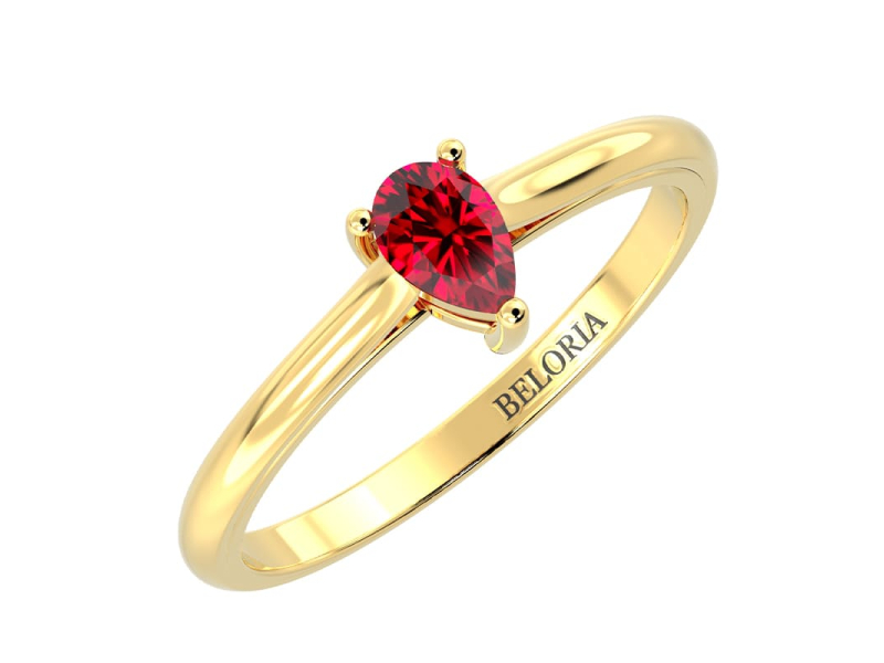Un solitaire tout en finesse, sublimé par un rubis en forme de poire et une monture délicate en or.
