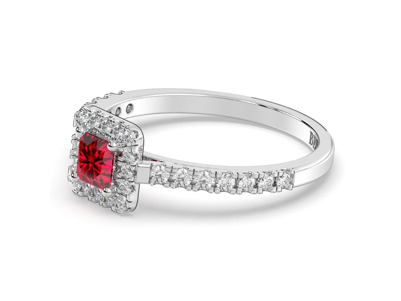 • La taille princesse du rubis reflète la lumière avec intensité, accentuée par le halo de diamants.